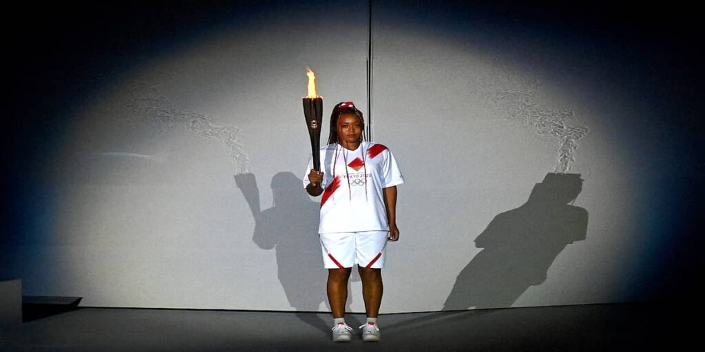 TOKYO, JAPAN – JULY 23: Naomi Osaka of Team Japan carries the Olympic torch towards the Olympic cauldron during the Opening Ceremony of the Tokyo 2020 Olympic Games at Olympic Stadium on July 23, 2021 in Tokyo, Japan. (Photo by Dylan Martinez – Pool/Getty Images)